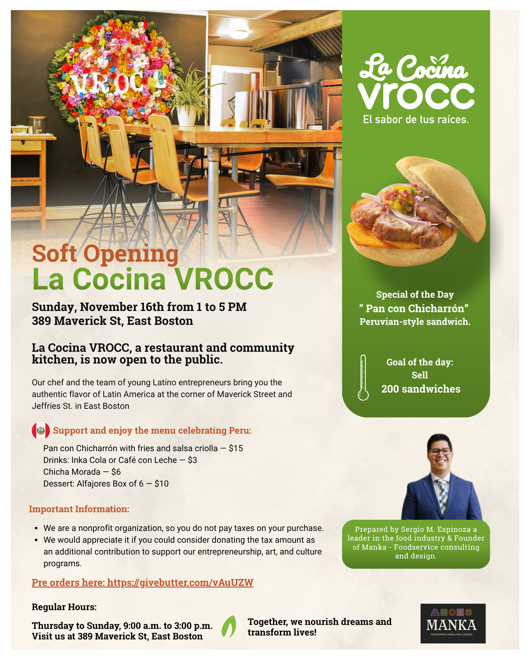 La Cocina VROCC, a restaurant and community kitchen, is now open to the public. Enjoy the authentic flavors of Latin America prepared by our chef and a team of young Latino entrepreneurs.