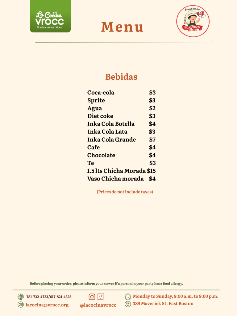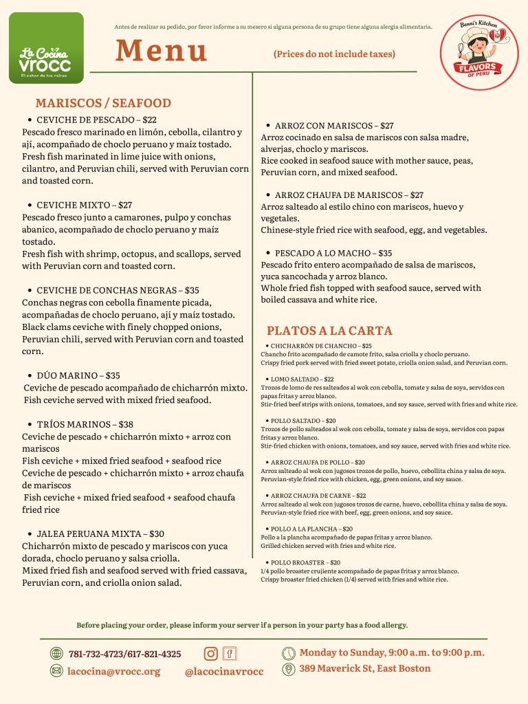 Located at 389 Maverick St, East Boston, MA 02128, La Cocina VROCC operates Thursday through Sunday, from 9:00 a.m. to 9:00 p.m.