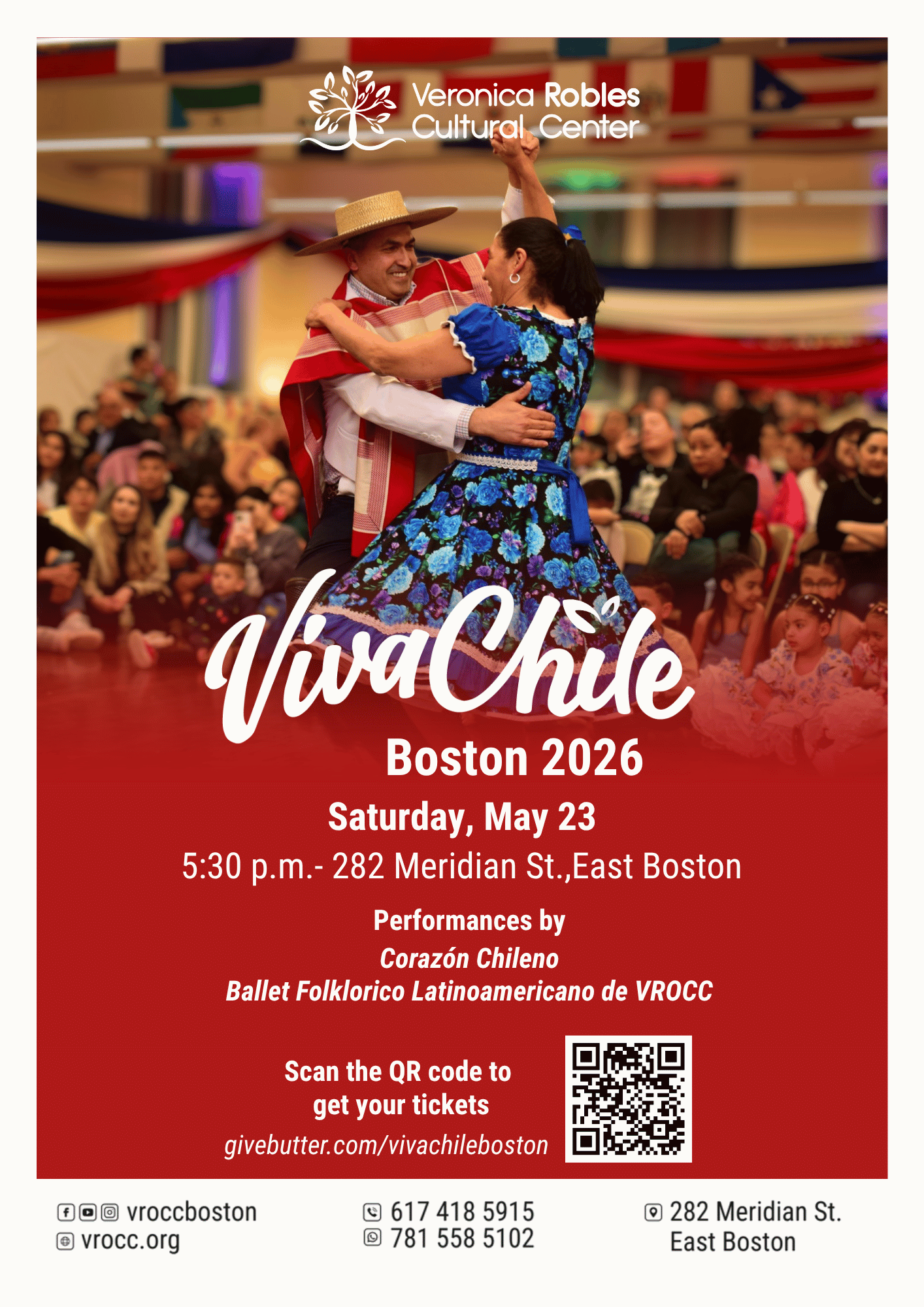 Our 12 annual festival ¡Viva Chile Boston! this year featuring special guests coming directly from Chile! You’re invited to enjoy a one-of-a-kind show presented by the Verónica Robles Cultural Center (VROCC). This year, we’ll be joined local groups El Ballet Folklórico de VROCC and Corazón Chileno, who will bring you the very best of Chile’s traditional music and dance. You’ll also be able to taste delicious Chilean food, cooked and prepared in La Cocina VROCC, bringing you the flavor of your roots. Come and immerse yourself in the cultural richness of this beautiful country—right here in Boston!